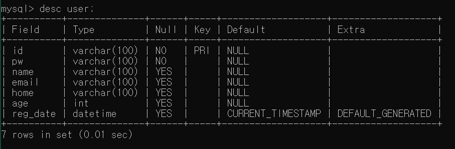 1. DB 생성 - root접속 ( mysql -uroot -pezen ) create database springtest; (DB생성) use mysql; (mysql은 근본 DB로 권한을 부여하는 기능이 있음! ) create user 'springuser'@'localhost' identified by 'mysql' ; (유저생성) grant all privileges on springtest.* to 'springuser'@'localhost' with grant option; (권한부여) flush privileges; (재시작) - 유저 변경 접속 ( mysql -uspringuser -pmysql ) use springtest; create table user( id varchar(100) ..
